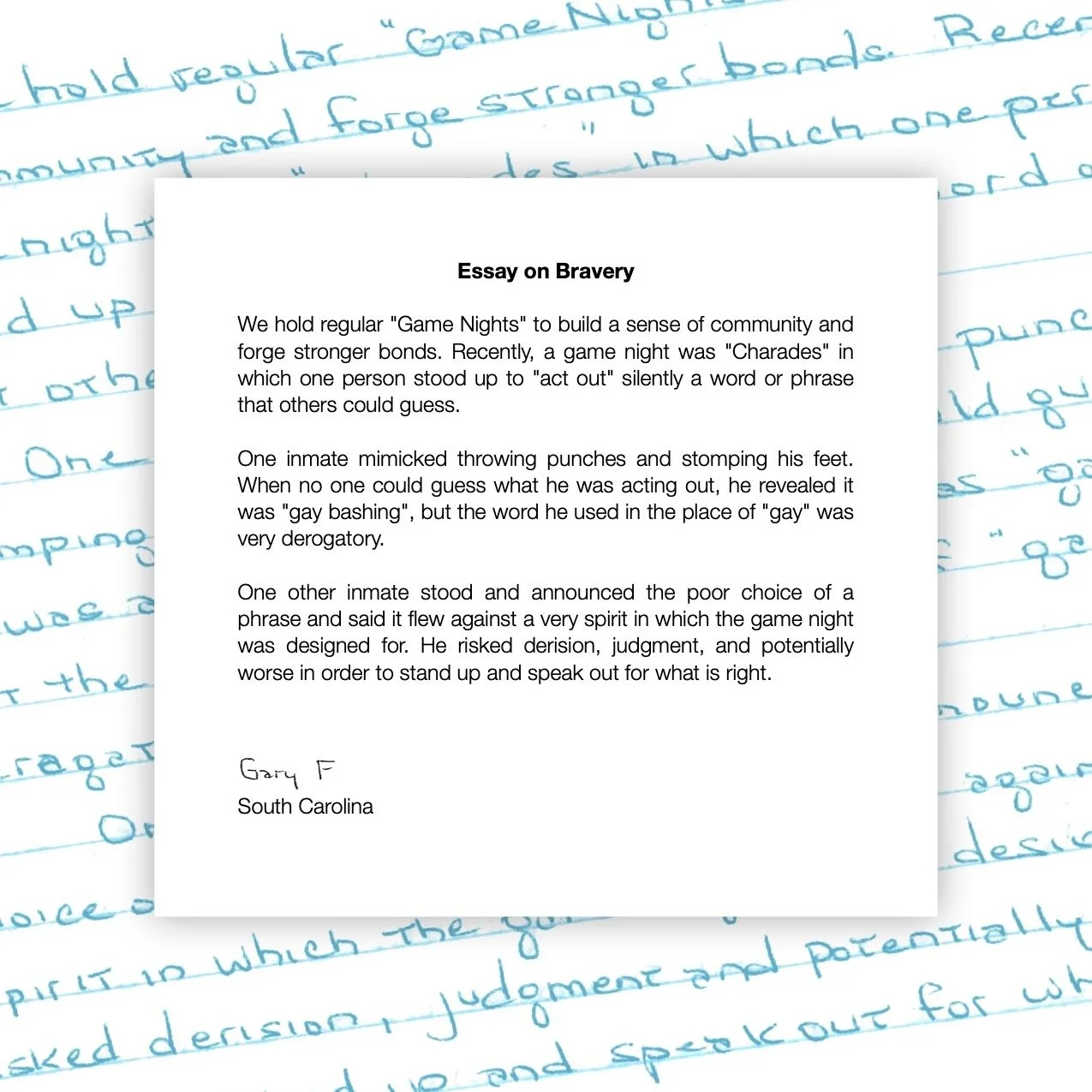 In his brief essay about an experience at "Game Night" at his institution, Gary demonstrates some wonderful strength spotting, describing a fellow incarcerated man who bravely spoke up against a derogatory action during a game of charades. Telling a peer, colleague, friend, or family member that something they are doing or saying is offensive can be so hard; it requires a particular kind of bravery that's challenging for all of us. But in his essay Gary reminds us of how very important and valuable this kind of bravery can be.