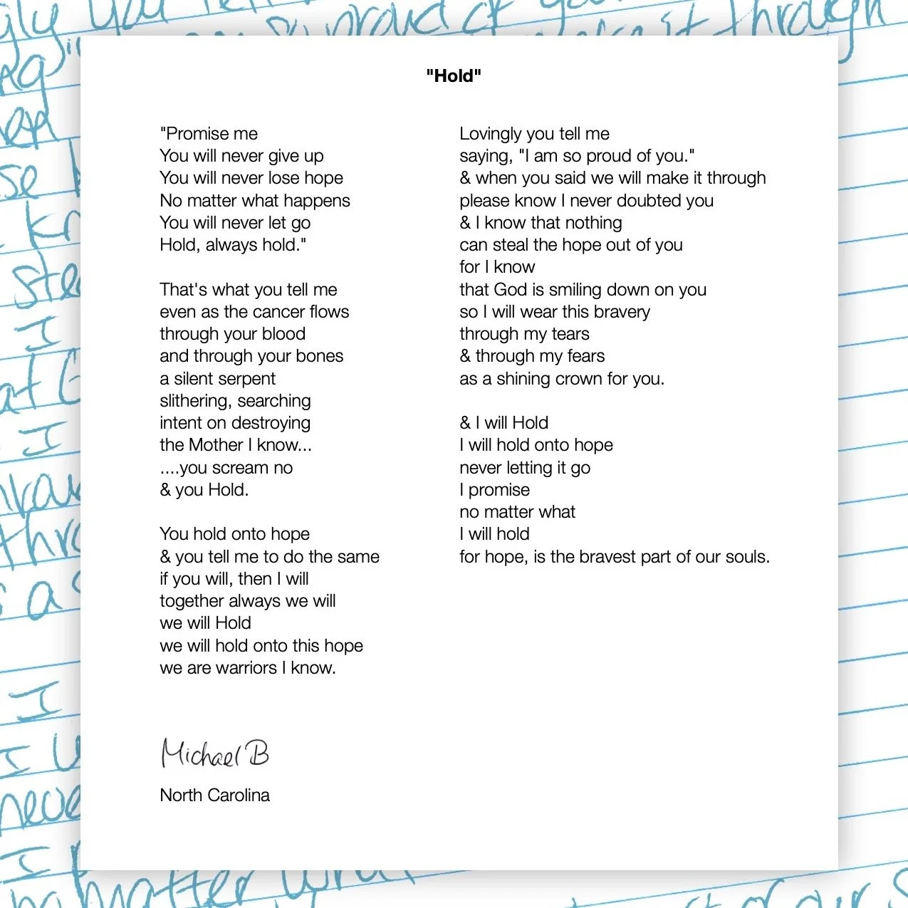 ![]()  Michael B. (NC)Michael has written this poem as a tribute to his mother and her courage in facing four different types of cancer, bravely fighting them all. "We will hold on to hope," he tells her. "We are warriors, I know."