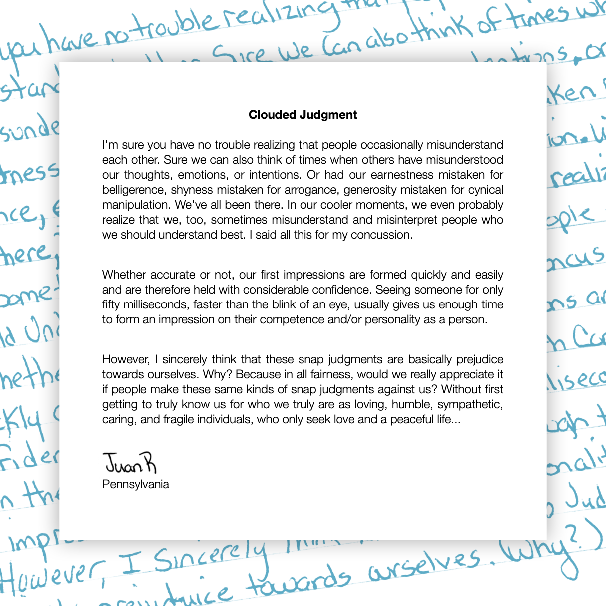Juan writes about the danger of making "snap judgments"--deciding we know a person well based on quick, and often careless, first impressions. We need to be mindful, he writes, of how it makes us feel when others do this to us, making assumptions about us instead of getting to know us.