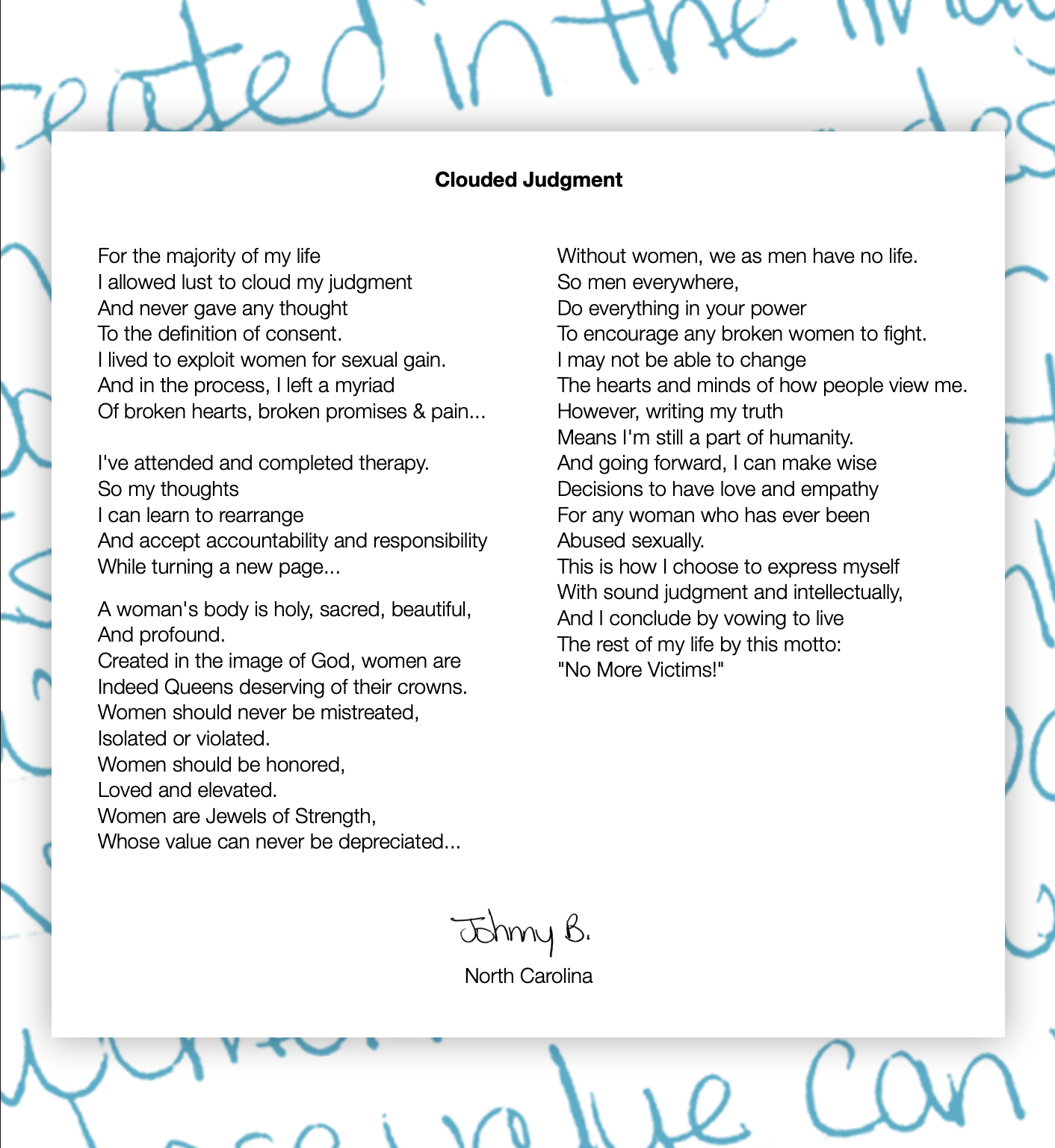 Description In his long poem “No More Victims,” Johnny describes coming to a newfound and deep respect for women; “I allowed lust to cloud my judgment,” he wrote. “And never gave any thought / To the definition of consent.” These are some excerpts from this powerful poem.