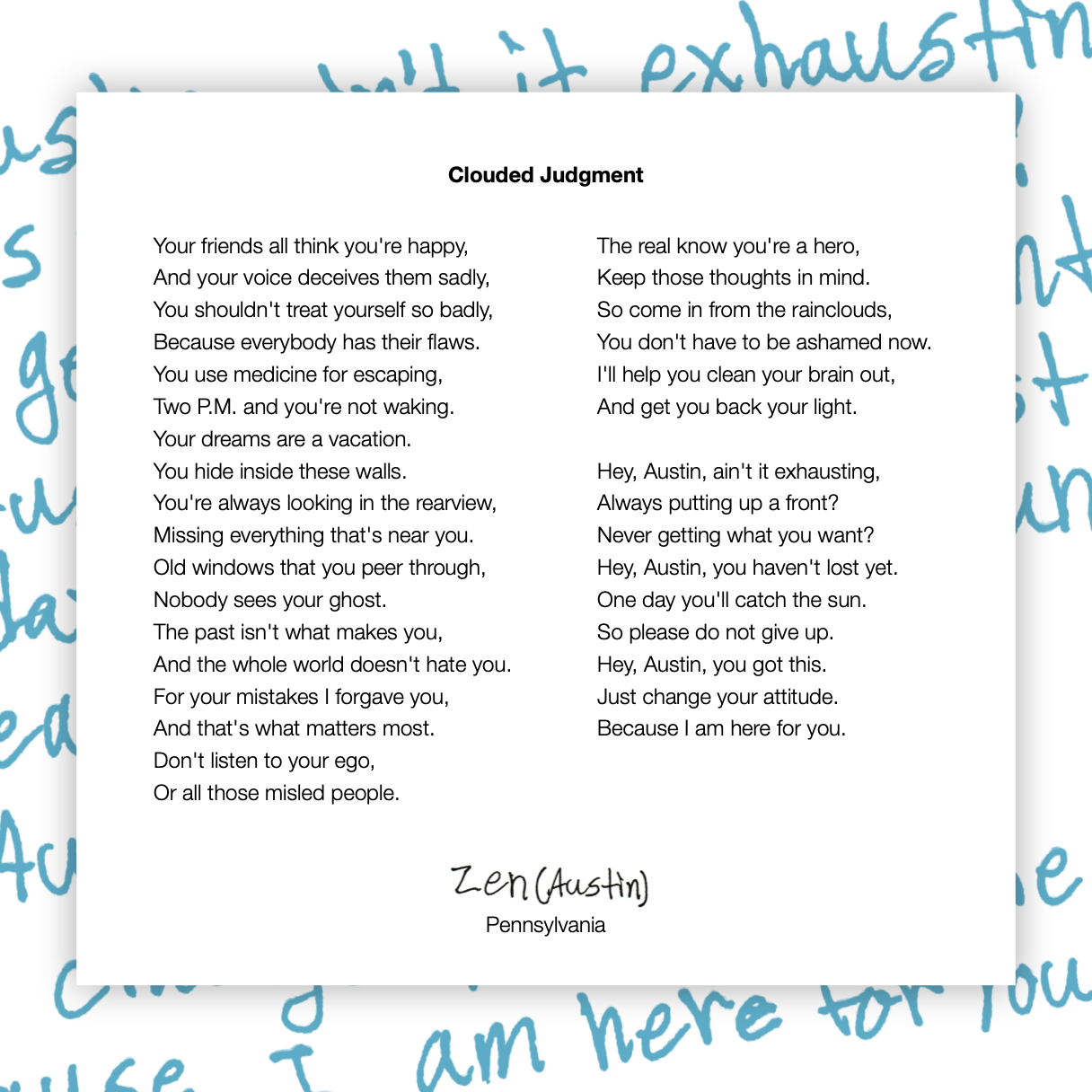 Zen (Austin)’s poem makes beautiful use of rhythm and rhyme, speaking to the self to comfort and support. “The past isn’t what makes you,” says the speaker of this poem, “and the whole world doesn’t hate you.”